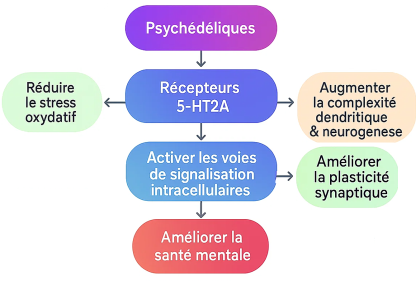 Les études en laboratoire le montrent, in vitro et in vivo : LSD, psilocybine, DMT et même MDMA et kétamine, stimulent la formation de nouveaux prolongements neuronaux et la création de points de contact entre neurones.