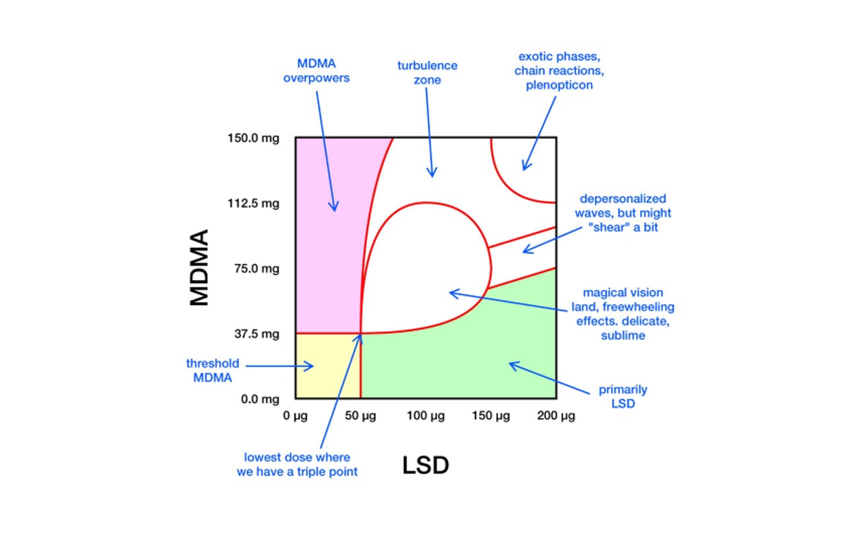 Ce qui m’a marqué dans notre échange, c’est qu’il explique d’une manière scientifique des choses que l’on retrouve souvent plus dans des trips reports que dans des études scientifiques, il décortique les dynamiques : la MDMA augmente la réceptivité émotionnelle, le LSD modifie la structure temporelle et la perception des objets mentaux, et le 2C-B joue parfois le rôle de liant sensoriel. Il m’a parlé d’exemples de rapports de trip où de faibles doses combinées, intelligemment synchronisées, permettent d’approcher la mort de l’ego sans passer par des montagnes russes dure et choquante qu’une forte dose de LSD pris seul par exemple peut faire vivre. L’idée, c’est d’optimiser la géométrie de l’expérience, pas d’empiler des doses. Dans sa logique, la finesse du timing, le Set et le Setting comptent autant que les substances.