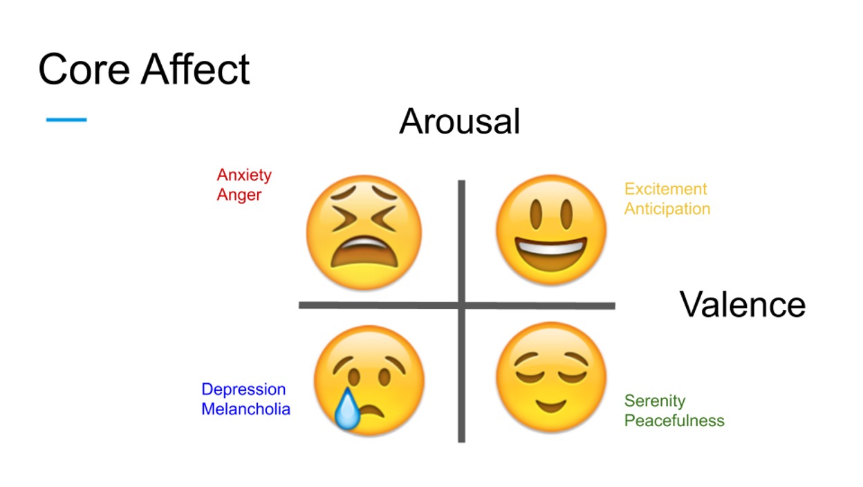 Si on regarde le schéma avec les emojis dans son article qui explique la théorie de la Valence, il montre grosso modo deux axes : verticalement l’arousal qui correspond au niveau d’excitation ou d’activation physiologique, et horizontalement la valence qui pointe la dimension plaisante ou déplaisante d’un état. Dans le coin en haut à droite, on trouve excitation et anticipation, avec une valence positive et un arousal élevé, ce qui correspond à ces états d’énergie euphorique rapide. En bas à gauche, on a la dépression et la mélancolie, avec une valence négative et un arousal faible, donc quelque chose de beaucoup plus lourd et languissant.