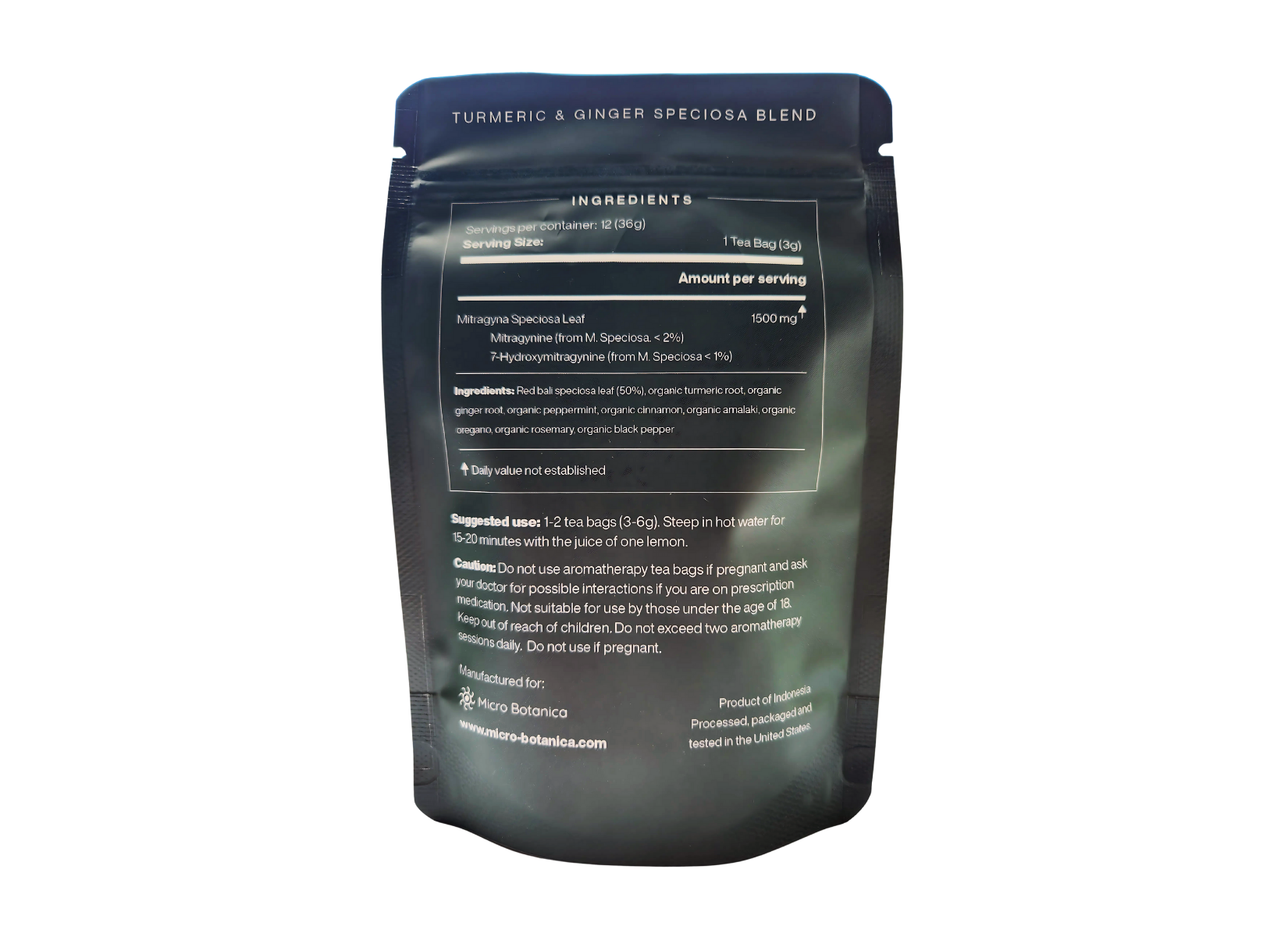 Each tea bag contains 3 grams of crushed leaf kratom. It is prepared in a cGMP certified facility. Each pouch contains 12 tea bags, giving you 36 grams of raw Mitragyna Speciosa in total.