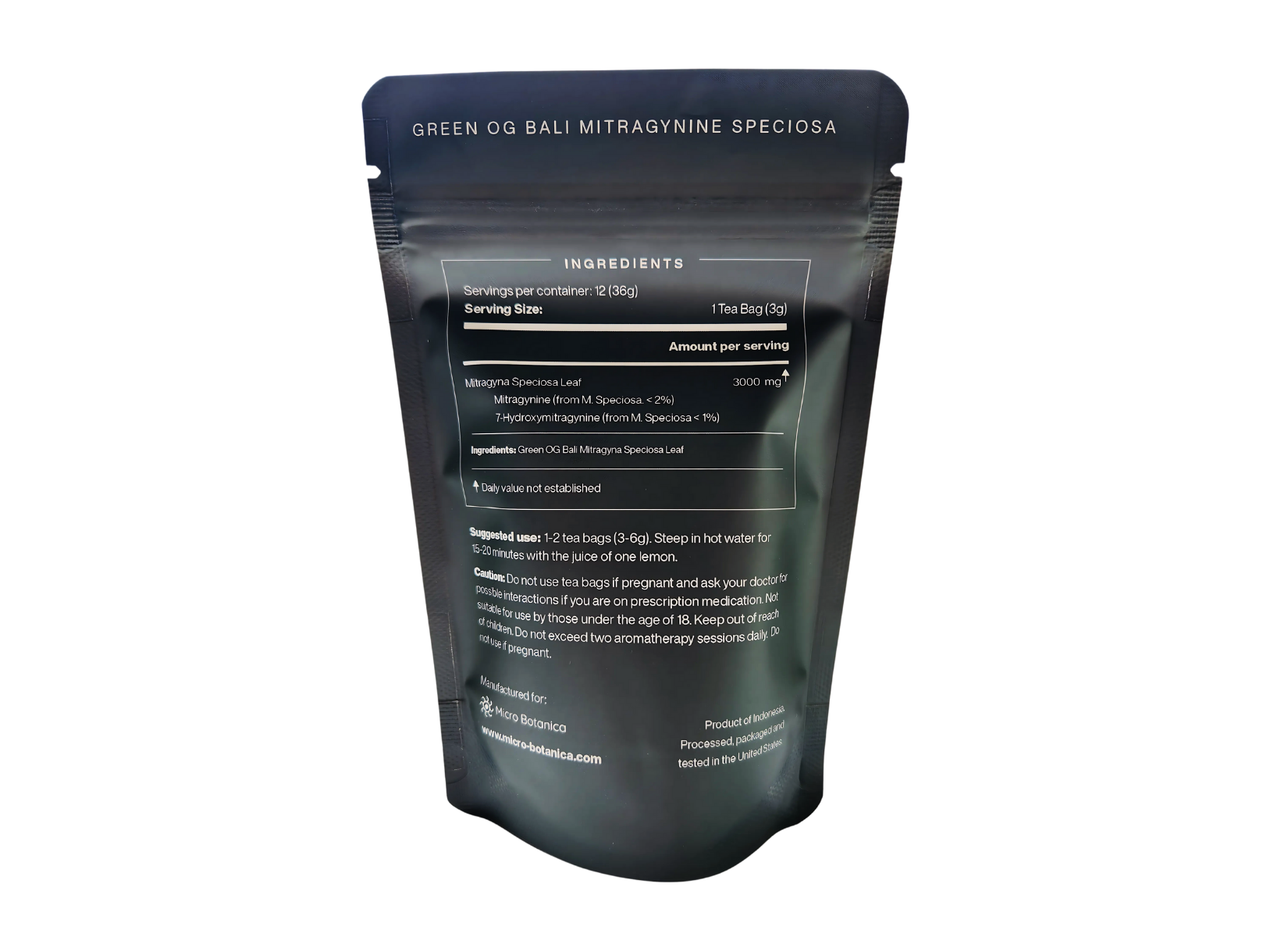 Each tea bag contains 3 grams of crushed leaf kratom. It is prepared in a cGMP certified facility. Each pouch contains 12 tea bags, giving you 36 grams of raw Mitragyna Speciosa in total.