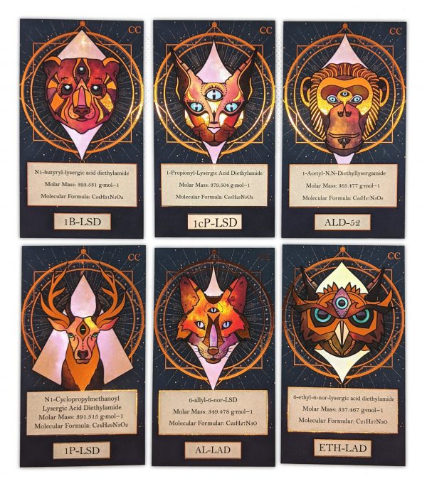 This is our first collection to be released and will be sent free with all orders of Lysergamides, with matching cards sent with the compounds purchased. Further ChemCard collections for Dissociatives, Tryptamines, and Phenethylamines are on their way with different artwork and artists for each chemical class.