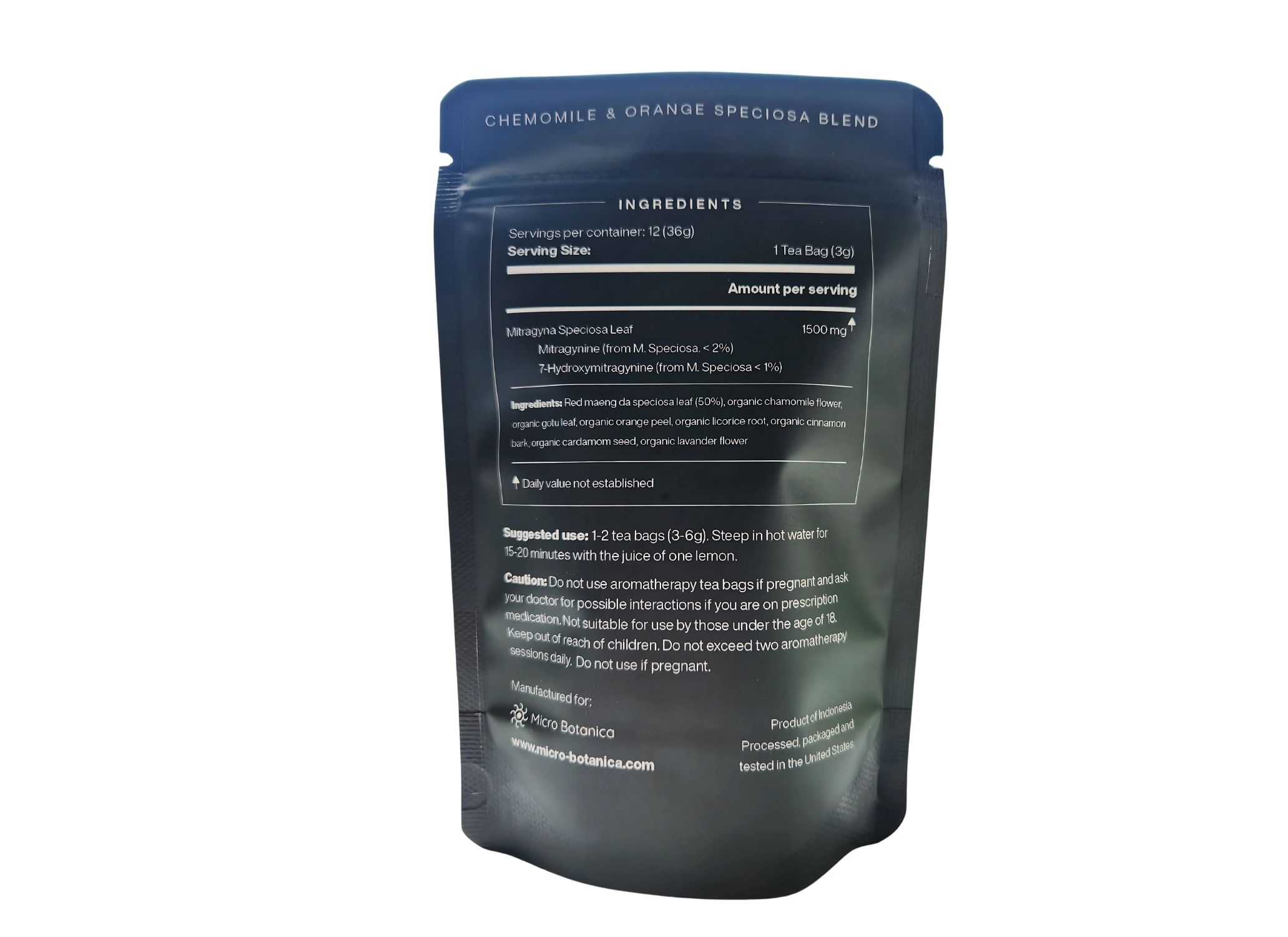 Each tea bag contains 3 grams of crushed leaf kratom. It is prepared in a cGMP certified facility. Each pouch contains 12 tea bags, giving you 36 grams of raw Mitragyna Speciosa in total.