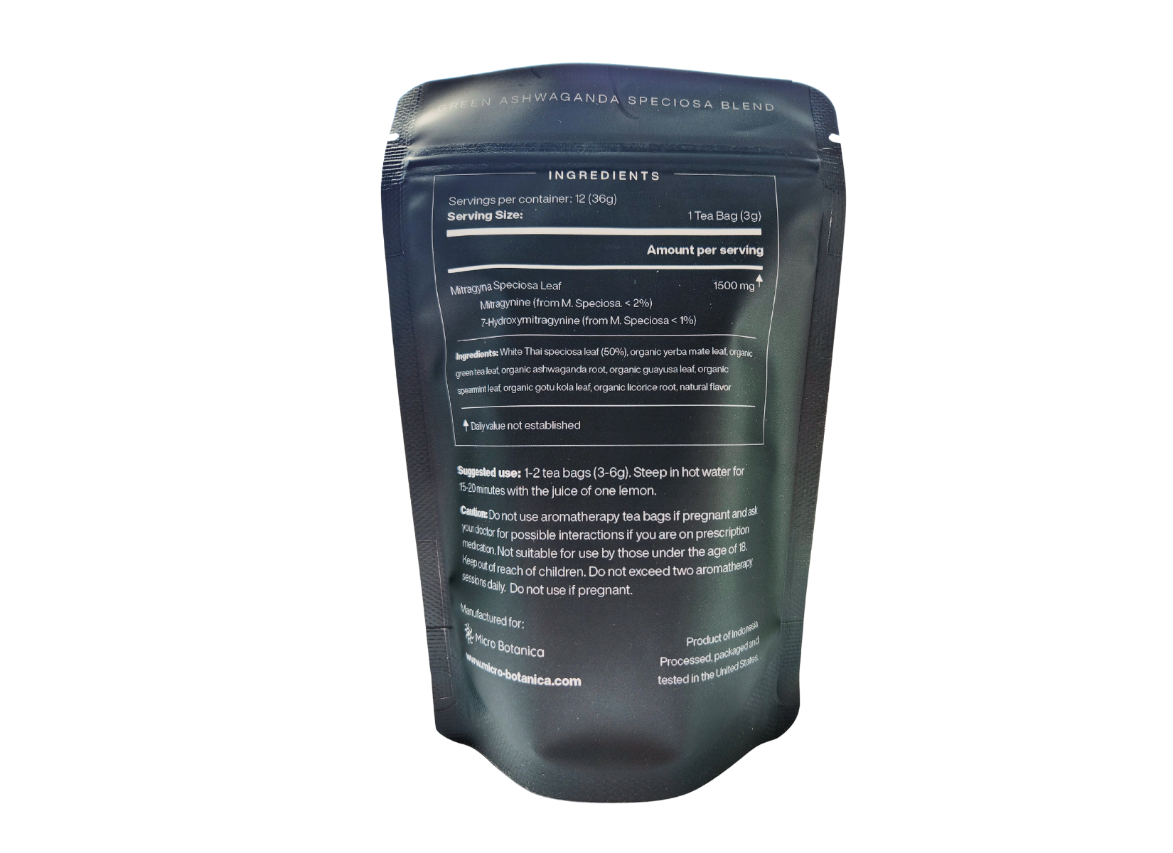Each tea bag contains 1.5 grams of crushed leaf kratom. It is prepared in a cGMP certified facility. Each pouch contains 12 tea bags, giving you 18 grams of raw Mitragyna Speciosa in total.